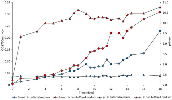 Optical density (OD750 nm; circles) and pH (triangles) during growth of Synechococcus PCC7942 in non-buffered (red symbols) and buffered (blue symbols) media. The points represent the average of two replicates.