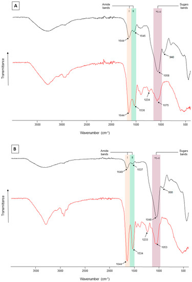 FT-IR spectra of (A) LMW and (B) HMW EPS fractions produced by Synechococcus PCC7942 grown in non-buffered (red spectra) and buffered (black spectra) media. Amides I-II absorb in the range of 1530–1650 cm−1 (pink and green bands), sulfate groups at ~1233 cm−1, polysaccharides at ~1040–1070 cm−1 (purple band), and the β-glycosidic linkages visible as a shoulder at 930–940 cm−1.