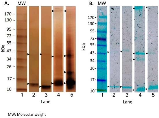- de Moreno, M.R.; Smith, J.F.; Smith, R.V. Silver Staining of Proteins in Polyacrylamide Gels: Increased Sensitivity through a Combined Coomassie Blue-Silver Stain Procedure. Anal. Biochem. 1985, 151, 466–470. [Google Scholar] [CrossRef]