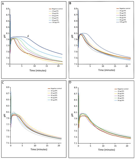 In vitro inhibition of calcium carbonate precipitation using (A) HMW EPS from non-buffered medium, (B) LMW EPS from non-buffered medium, (C) HMW EPS from buffered medium and (D) LMW EPS from buffered medium. Each panel shows the experiments using EPS extracts with concentrations of 10, 20, 30, 40, 50 and 150 µg·mL−1 on CaCO3 inhibition experiment. The decrease in pH indicates precipitation and a plateau inhibition of carbonate precipitation. A larger plateau indicates stronger inhibition of CaCO3 precipitation (e.g., see arrow in panel (A)). The results in each panel represent single experiments. Replication using HMW EPS from non-buffered medium showed identical results (see Supplementary Figure S1).
