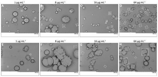 In vitro forced CaCO3 precipitation in the presence of (A–D) HMW EPS fraction from non-buffered and (E–H) buffered media at increasing EPS concentrations (1, 8, 16 and 64 µg·mL−1). SEM images show two CaCO3 morphologies: rhombohedral (white squares) and spheroidal (black circles) crystals (in some cases shown as polycrystalline spheres, e.g., panel (F)). In EPS from non-buffered medium (A–D), a large number of small crystals formed. In EPS from buffered medium (E–H), a small number of large crystals precipitated. The scale bar (black) at the bottom of the images is 200 µm.