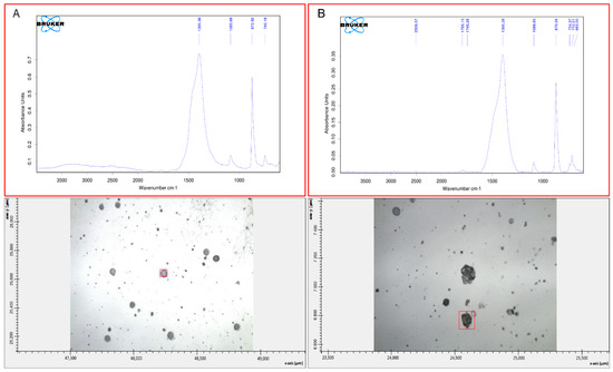 FT-IR spectra of vaterite (A) and calcite (B). The two calcium carbonate polymorphs precipitated in solutions of both HMW and LMW EPS extracted from buffered and non-buffered media. Data shown for HMW EPS from buffered medium with a concentration of (A) 4 µg·mL−1 and (B) 2 µg·mL−1.