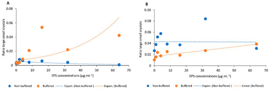 Ratios between large and small crystals that precipitated in solutions of (A) the HMW EPS fraction from non-buffered medium (blue symbols and trend line) and from buffered medium (orange symbols and trend line); (B) the LMW EPS fraction from non-buffered medium (blue symbols and trend line) and from buffered medium (orange symbols and trend line. The orange and blue symbols shown at each EPS concentration (0–64 µg·mL−1) indicate individual ratios for single precipitation experiments.