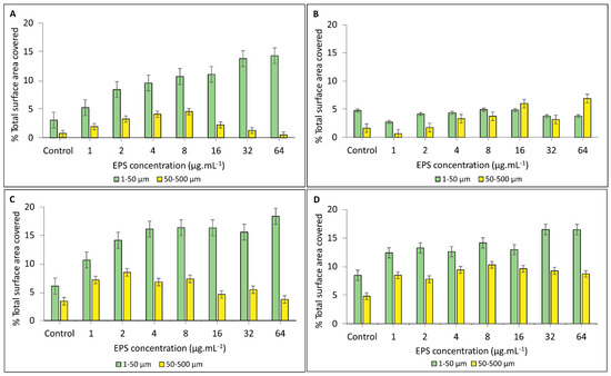 Estimation of carbonate precipitation in solutions containing the HMW EPS fraction from (A) non-buffered and (B) buffered growth medium and solutions containing the LMW EPS fraction from (C) non-buffered and (D) buffered conditions. The estimates are based on the percentage of surface area covered by small (1–50 µm) and large (50–500 µm) crystals size classes in 1–64 µg·mL−1 EPS concentrations.