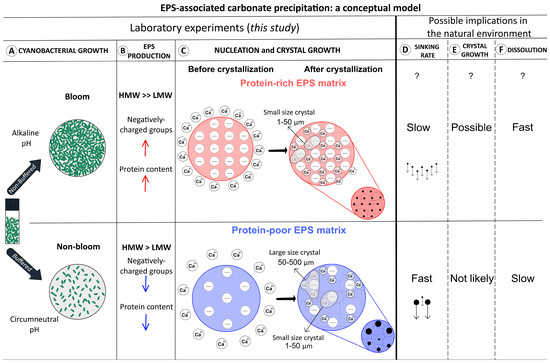 Picoplankton growth in poorly buffered natural systems resembles that of our non-buffered medium. The physiological response of Synechococcus to growth at pH 10.5, particularly the specific EPS properties produced under alkaline conditions, may thus shed light on cyanobacterial blooms in freshwater lakes [20,21]) (Figure 9A). These picoplankton blooms are typically characterized by high cell densities and photosynthesis rates [19,51,131,132,133]. The rapid uptake of DIC increases the pH ([67]; see Equation (2)), causing a physiological response of the picoplankton, that based on our results, could lead to the production of protein-rich, acidic EPS (Figure 9B). These EPS are either associated with the cell surface (i.e., capsular EPS (cEPS), tightly bound to the cell wall), or are suspended in the aqueous phase as soluble EPS (sEPS) [33]. Cyanobacteria often have a thick mucoid EPS sheath (i.e., cEPS) surrounding their cell wall [134]), but also excrete carbohydrates, possible including sEPS, as a photosynthetic “carbon overflow” mechanism under nutrient limitation, notably that of nitrogen and phosphorous [36,135,136].