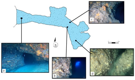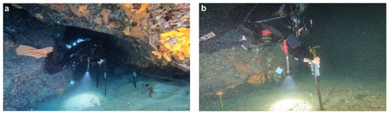 A notable feature is a water spring from a fissure at the end of the cave, and then a water flow directed towards the entrance that carries muddy sediment from the floor to the outside, as documented by scuba observations (Figure 1d and Figure 2a). Although our preliminary data do not allow for the demonstration of the presence of freshwaters inside the cave, the occurrence of freshwater springs in submerged caves in the Adriatic Sea has been already documented []. For this characteristic, the cavity could be considered as active, or partially active, and to all intents and purposes defined as a karst resurgence (Vrulja: For a general description of both submarine resurgences and submarine springs, see []).