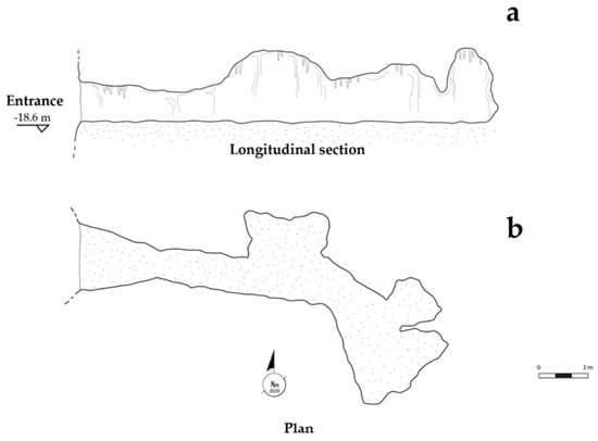 Longitudinal vertical section (a) and plan (b) of the Elle cave.