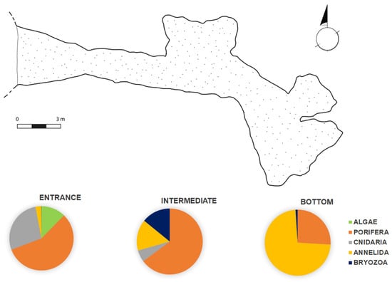 Finally, the biological evidence of the present study supports the speleogenetic hypothesis proposed for the cave. Indeed, the benthic coverage, which was total at the entrance, remained close to 100% even in the innermost sector, thus indicating a significant degree of water circulation in the cave []. This fact is also confirmed by the arrangement of some faunal components, such as the serpulids. Indeed, in the innermost sector of the cave, most of their largest tubes were particularly long and parallel along a definite alignment in the same direction, as an indication of the existence of a water flow from the bottom towards the entrance of the cave.