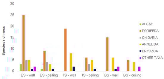 The benthic assemblage detected on the walls and ceiling of the Elle cave comprised 63 living taxa belonging to nine phyla: Two algae and seven invertebrate phyla (Table 5). The assemblages varied in both the species/taxa composition and cover values from the entrance to the inner cave sector (Figure 4 and Figure 5). Rhodophyta and Chlorophyta algae were found only at the entrance together with all of the other taxonomic groups (Figure 6a), except for Brachiopoda, which were observed in the innermost area of the cave. In addition to sponges, which were the most represented, cnidarians and polychaetes included multiple species, while molluscs, brachiopods, and ascidians were observed with a single species identified. Porifera encompass 39 taxa, as follows: One taxon of Calcarea, two of Homoscleromorpha, and 36 of Demospongiae, with 20 of them identified to the species level (Table 5). Sponges were not uniformly distributed along the sectors of the cave. Most of the recorded species were concentrated at the ES (87.1%), while their number progressively decreased towards the IS (64.1%) and the BS (51.3%) with a preferential distribution on the walls rather than on the ceiling (Figure 5). Sponge cover was 56.9% of the substrate at the ES, reached a maximum in the IS (64.8%), and decreased to 25.9% at the IS (Figure 4). At the ES, the sponge assemblage was rich and diversified. The most common species were Spirastrella spp., which covered a wide portion of the substrate both on the wall and ceiling of the cave, Agelas oroides, Petrosia ficiformis, and Phorbas tenacior, found mainly close to the entrance of the cave (Figure 6a). In the IS Spirastrella spp., together with Dendroxea cf. lenis and the Homoscleromorpha cf., Pseudocorticium jarrei dominated the sponge assemblage of the walls (Figure 6c). The abundance of Spirastrella spp. and D. cf. lenis decreased sharply on the ceiling and was completely replaced by cf. P. jarrei, which was clearly dominant in the IS. In the BS, excluding cf. P. jarrei, this pattern was completely replaced by a few other species. In particular, the encrusting blue sponge (Demospongiae 10, Table 5), a few specimens of cf. P. jarrei and other small encrusting sponge species characterized most assemblages of this cave sector. Petrobiona massiliana was the only calcareous sponge species recorded in the cave (Figure 6d). The sponge was abundant mainly in the BS with preferential distribution on the walls.