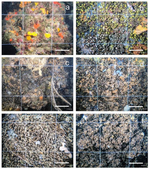 The benthic organisms observed in the photo-quadrat images have been identified at the lowest possible taxonomic level. The quantitative contribution was evaluated by measuring the coverage of each taxon in relation to the total area covered by benthos and referred to as a percentage. ImageJ software was used for the analysis of the photo images.