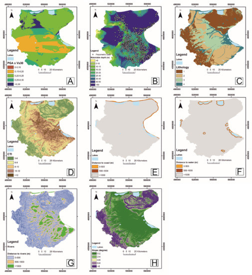 | Main Variables | Distance to River (m) | Distance to Coast (m) | Slope (°) | Water Table Depth (m) | Distance to Water Body (m) | Lithology | PGA-VS30 | CTI | Weights |
