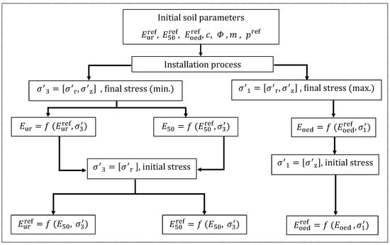 After evaluation of the changes in the stresses upon column installation, the post-installation stiffness ( and ) from the installation stage were calculated according to the Hardening Soil (HS) model formulation. The challenge at this stage was to correlate the stiffness at the post-installation stress field to the stiffness components at a reference pressure (, and ) as the construction model’s input. The methodology adopted in the literature to calculate the reference stiffness values is illustrated in Figure 2. The approach is based on the fact that changes in stress results in stiffness evolution []. To obtain the stiffness values at reference pressure, two steps were followed: