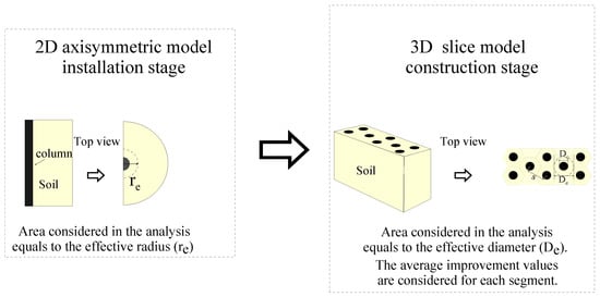 As mentioned before, simulation of the column installation in the construction model with the complicated geometry including several granular columns is computationally impossible [,]. For instance, modelling the construction stage immediately after column installation is inconvenient due to the highly deformed mesh and possible inadequacy of boundary conditions []. As a result, it was thought acceptable to represent the problem separately. The division of the model into two models would help to reduce the computational effort and to split the dimensional complexity of the models for the rather 2D installation of a single column and construction of the infrastructure on a large number of columns that often requires a 3D simulation procedure. In this study, effects of column installation on soil state variables were investigated in a 2-dimensional axisymmetric model, while the obtained post-installation soil parameters and stress field were transferred to the construction model as predefined initial conditions. The process to transmit data (internal variables, state variables, and stress states) from the installation model to the construction model is important in this scenario. This concept is illustrated in Figure 1. The earth pressure coefficients after installation () were represented by the changes in radial stresses, while the vertical stresses remained unchanged. These values formed the installation model and were incorporated into the initial stress generation phase of the construction stage model.