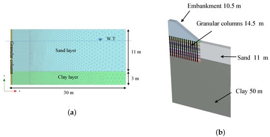 The bottom-feed method was used to install the granular columns with a length of 14.5 m and diameter of 0.7 m in a triangular pattern, as shown in Figure 6b. Assuming a height of 11 m for the lacustrine sand layer, 3.5 m of the column was assumed to be introduced into the soft clay layer.