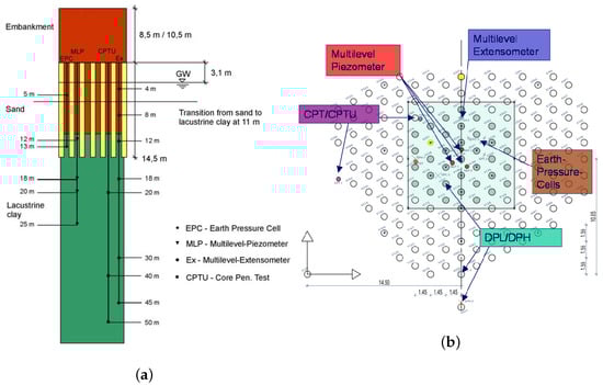 Details of Klagenfurt site. (a) Cross-section with soil layers and measuring devices; (b) plan view of arrangement of granular column and measuring device in field, ref. [].