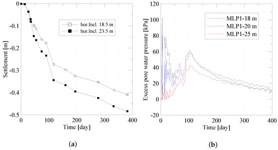 Field measurement in Klagenfurt Project. (a) vertical displacements at surface; (b) excess pore water pressures.