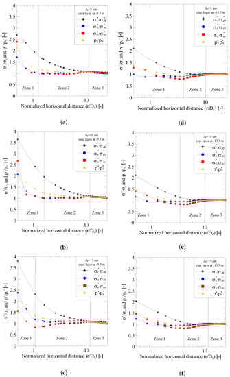 Stress distribution in subsoil after consolidation. (a) sand layer ( = 5 cm); (b) sand layer ( = 10 cm); (c) sand layer ( = 15 cm); (d) clay layer ( = 5 cm); (e) clay layer ( = 10 cm); (f) clay layer ( = 15 cm).