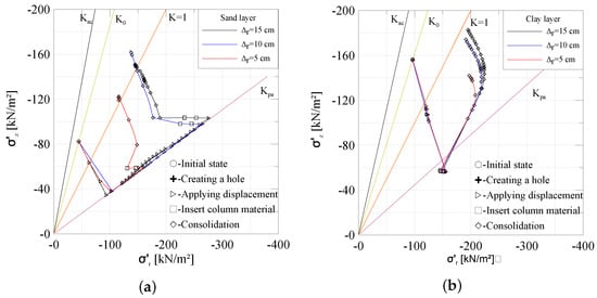 Figure 9a,b show the stress path in the (, ) space plotted for two different layers at depths of −5.5 m and −12.5 m in sand and clay layers, respectively. Figure 9a,b show that the initial stresses prior to the column installation are and . Therefore, the starting point for the first two stages (the stress initialization and the creation of the hole) lies on the line for both the sand and clay layers. The important change in the stresses occurs during the expansion phase, where the radial stresses increase. Different behaviours can be noticed between the sand and clay layers during the expansion phase, represented by the fluctuations of the vertical stress during this phase. These behaviours can be attributed to the dilatancy angle in the sand. The earth’s pressure coefficient increases to reach the passive state during this phase. After the expansion, the prescribed displacements are removed and the dummy material is replaced by granular material, causing relaxation in the surrounding soil. The stresses in the soil fluctuate. After the complete dissipation of excess pore water pressure, the effective vertical and radial stress increases, leading to the new earth pressure coefficient between the passive state and the . This range of earth pressure coefficient is similar to that observed by [].