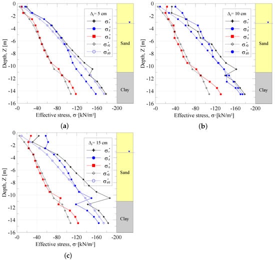 The changes in stress state and stiffness after the granular column installation are different from one layer to another based on several factors, such as the soil properties and the stress level. To discuss these deviations, the distribution of the stresses at distance with depth for different degrees of expansion is presented in Figure 10. As seen, a significant increase in the radial stresses occurs in all layers, especially in sand upon the column installation. Such an increase in the radial stress is proportional to the increase in the expansion degrees. The variation of vertical stresses due to the column installation indicate a small rise in the upper layers from their initial values where the intensity of the increase in reduces with depth. On the other hand, there is no significant change in the circumferential stresses . As shown in Figure 10, the changes in stress components due to the column installation are proportional with the increase in the degree of expansion (applied prescribed displacement ).
