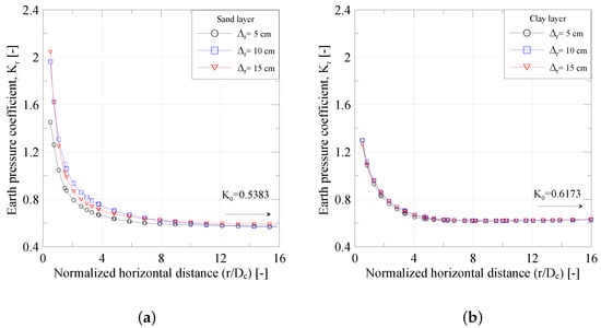 The radial earth pressure coefficient shows significant increases from the initial value of , extending to distances greater than 12 times the column diameter in the sand layer, see Figure 11a, but less than six times the column diameter in the clay layer, see Figure 11b. For = 15 cm, the sand and clay layer improvement is approximately 3.7 and 2.1 times the , respectively. The figure shows that improvement in the sand is more extensive than in the clay layer, and this improvement is affected by the degree of expansion. These distributions of earth pressure coefficients are similar to those discovered by [,,].
