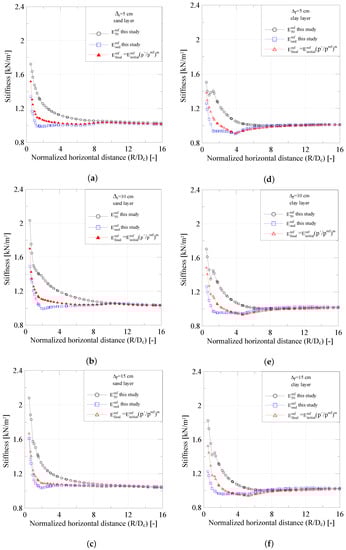 Variation of stiffness versus normalized distance () after consolidation. (a) sand layer ( = 5 cm); (b) sand layer ( = 10 cm); (c) sand layer ( = 15 cm); (d) clay layer ( = 5 cm); (e) clay layer ( = 10 cm); (f) clay layer ( = 15 cm).