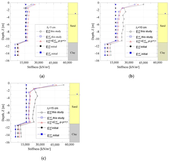 - The stiffness at the reference pressure that corresponds to post-installation stiffness can be obtained according to the initial geostatic stresses or and the stiffness calculated in the previous calculation step according to the HS model Equation (2):In the same way, and are calculated to be adopted in the second model.
