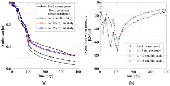 Comparison of the field measurement and finite element model. (a) settlement for different cavity expansion degrees, (b) excess pore pressure at 20 m.