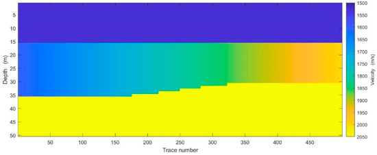 Synthetic Earth model. In the layer below the sea floor, the velocity increases from 1600 to 2000 m/s from left to right, and the layer thickness decreases from 20 to 15 m. We simulated 50 traces, equally spaced from left to right along the model.