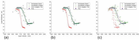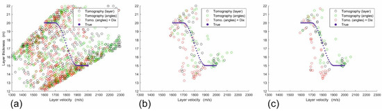 Figure 3a allows comparing of the estimated layer velocity and thickness obtained when jointly inverting all mentioned primaries and multiples (black circles) by tomography, i.e., by minimizing the object functions (11) or (22). The red circles are obtained instead by using the Equations (9) and (10), based on Dix Formula (7) as post-processing of the inversion in the angle domain. The blue dots correspond to the true model values. We see that the tomographic solutions in the velocity-thickness domain (black circles) are quite scattered, although close to the correct solution. The solution in the angles’ domain (green circles) is just perfect, nicely overlapping the true solution (blue dots). The Dix solution (red circles) are smoothly coherent but systematically lower than the true ones. We then added random errors in the travel times, perturbing each trace 10 times, to simulate picking errors or some noise contribution in the field records, as ambient noise or other interfering events. As a result, we get a mild scattering when the maximum noise percentage is 0.001% (Figure 3b) and significant for 0.01% (Figure 3c). In all cases, the Dix solutions rarely exceed the boundary traced by the blue dots, ending up as a slightly lower dispersion.