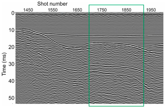 Figure 7 shows a seismic section after the basic processing mentioned above. We see a strong direct arrival at less than 2 ms and a clear reflection for the lake floor between 10 ms (on the left) and 13 ms (on the right). Harder rocks outcrop on the left, while a small basin with a very different seismic stratigraphy is visible at the center and at right. We selected 100 traces indicated by the green rectangle, between shot 1697 and 1931, because the interpretation and picking of the key events is reliable, especially when taking into account the full picture.