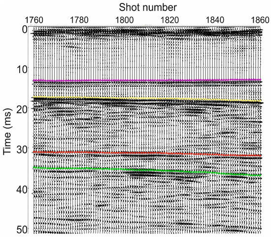 Expanded detail with picked horizons of the central part of Figure 7, from shot point 1760 to 1860: lake floor (violet), base of shallow sediments (yellow), peg-leg multiple (red) and simple multiple (green).
