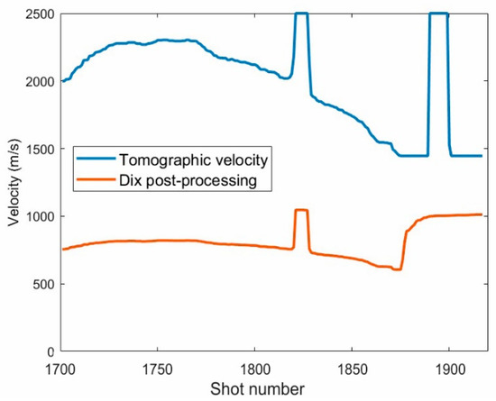 Estimated velocities with a 7-term median filtering for the shallow layer, within the area highlighted in Figure 7: tomographic inversion in the angle domain (blue line) and with the Dix post-processing (orange line).