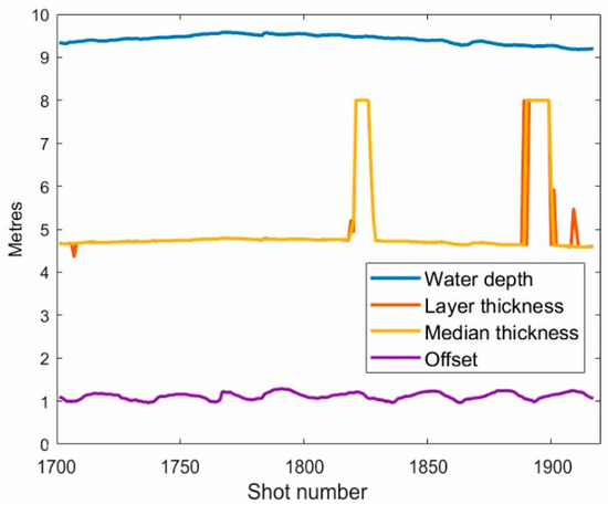In Figure 10 the lowest curve (violet line) shows the estimated offset, obtained by picking the direct arrival and dividing it by the water velocity. This curve is slightly bumpy, but with a kind of regularity, probably due to a feathering and variable tension of the trailed cable during the acquisition. Such a curve is not correlated at all with the thickness and velocity estimations, and this fact supports its reliability. The offset variations range from 0.98 to 1.24 m, which are quite large percentwise and so cannot be neglected (see also [27]).