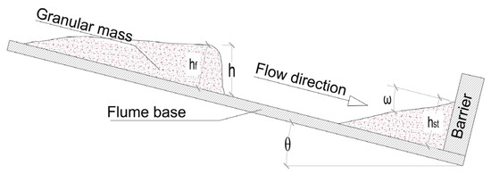 The flow was recorded by video (three cameras with 1020 × 720 px, 100 fps). The impact force on the barriers was measured with a load cell (type Hottinger Brüel & Kajer (HBM, Vienna, Austria)—U10 Force Transducer/1.25 kN, 4800 Hz). Two high-performance laser distance sensors (type, Baumer, Frauenfeld, Switzerland, OM70-L0600 2400 HZ) were used to determine the flow height ℎf. By placing the two lasers at a distance of approximately 27.5 cm, the velocity of the granular mass was also able to be determined from runtime measurements. In addition, the velocity was determined with the help of a line grid at a distance of 5 × 5 mm and the video recordings. The evaluation of the geometric quantities and the forces from the laboratory experiments, as well as the determination of the dimensionless Froude number Fr, can be taken from Table 5.