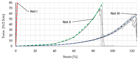 Tensile tests from a 2.5 cm-wide strip of the flexible material of Net I, Net II and Net III; colored lines are the mean values of the tensile test results.