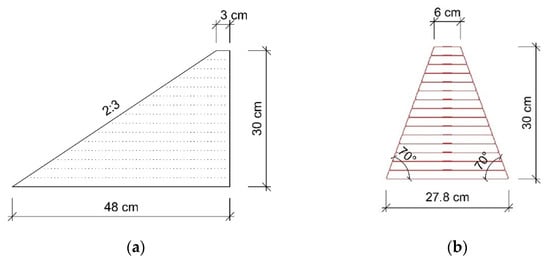 Geometry of the two types of embankments: (a) earth dam without geotextiles, inclination 2:3 on the impact side; (b) reinforced dam with geotextiles, inclination 70° on the impact side.