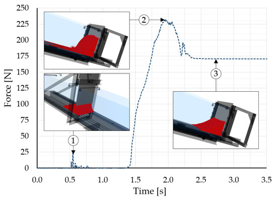 A disadvantage of determining the maximum impact force is the complexity of obtaining the dynamic coefficients. The comparison of “Fluid Impact Models” published by [29] revealed that, for example, [30,31,32] recommend different coefficients as dynamic factors. Based on the equations of the conservation of momentum, impact coefficients α between 0.7 and 12 are recommended. According to [33], an impact coefficient α of 2.0 is recommended.
