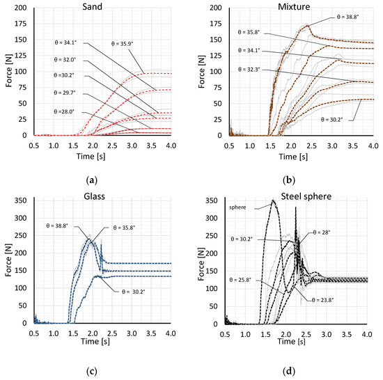 Figure 12 shows the force–time histories for the earth dams and geogrid-reinforced dam for the different materials. Analogous to the rigid barrier, the steel and glass spheres reached the highest impact force Fpeak. The peak impact forces Fpeak were also achieved here by the steel spheres. If the test results for the individual dam types are compared at an inclination of 30.2°, it can be seen that a consistently higher peak impact force Fpeak was obtained for the earth dam type, irrespective of the material used. The same material was used for both types of embankments. A transverse distribution through the geogrid-reinforced elements in the dam can be neglected due to the small width of the laboratory experiments (32.5 cm) and the measurement of the force as a total impact. The geogrid-reinforced embankment can be made much steeper on the impact side (Figure 4). A steeper slope encouraged the faster formation of a dead zone. Further impulsive effects of the material were thus reduced. In Figure 12, it can be seen that the geogrid-reinforced embankments for the mixture and the glass spheres were subjected to less action.