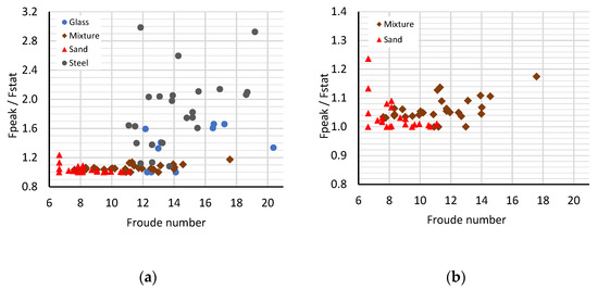 Fpeak/Fstat ratio for different Froude numbers for impacts on a rigid barrier: (a) for all materials, and (b) for the natural material sand and the mixture.