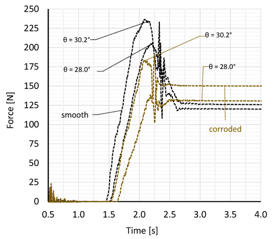 Comparison of the impact force–time history of the corroded and the smooth steel spheres for the inclinations of the flume base of 28° and 30.2°.