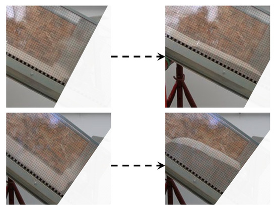 To investigate the effects of rock avalanches on a protection embankment, two different types of embankments—embankments with and without geotextiles—were investigated in the experiments. The embankments without geotextiles were designed with an inclination to the flume on the impact side of approximately 3:2, and with a crown width of 6 cm and a height of 30 cm. The embankments with geotextiles were designed as geogrid-reinforced embankments with a slope on the action side of 70°, a crest width of 6 cm and a height of 30 cm (Figure 4). The spacing of the model geogrids [15] was 2 cm. A total of 35 laboratory experiments were carried out to investigate the effects on the embankment.