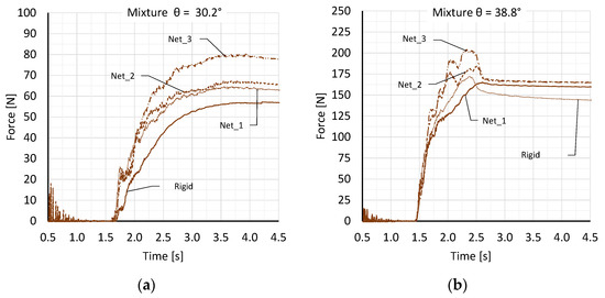 Force–time history for flexible barriers, mixture and inclinations of the flume base (θ) of (a) 30.2° and (b) 38.8°.