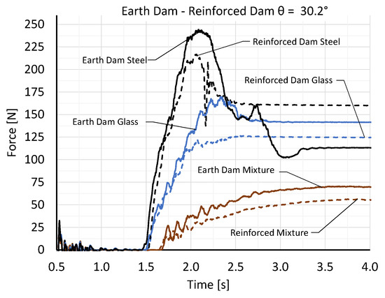Force–time history comparison between an earth dam and a geogrid-reinforced dam for an inclination of the flume base of θ = 30.2°.