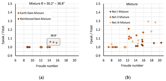 Fpeak/Fstat as a function of the barrier and the Froude number for (a) Dam and (b) Nets. Test results in the frame in Figure 13 (a) for the inclination of 38.8°.