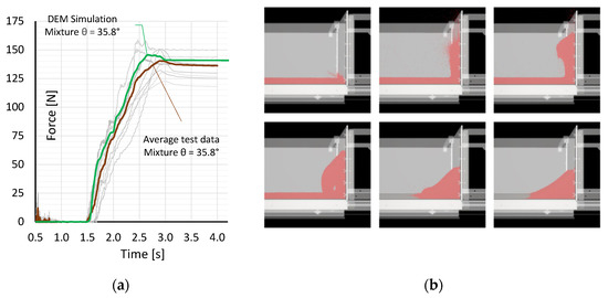 (a) Force–time history comparison of model test data with the results of the DEM simulation; (b) images from the DEM simulation showing the impact in 6 steps.