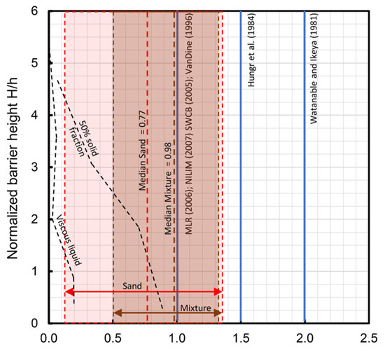 Figure 17 shows the interpretation of Equation (15). The authors of [25] conducted a series of flume experiments with dry granular flows and a rigid barrier. The findings from this study were that the dead zone can attenuate the dynamic impact of the subsequent flow on the barrier [5] and the dynamic pressure coefficient in a range from 0.2 to 0.5.