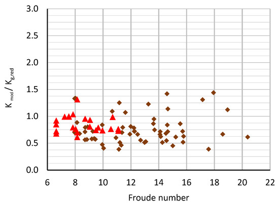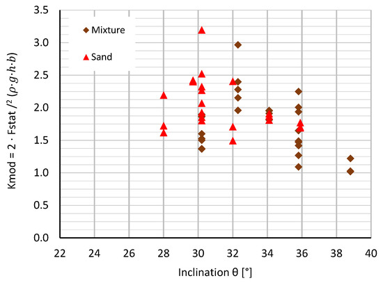 For inclinations of the transport plane θ > φi, a slope inclination with the internal friction angle φi was established at the surface of the deposit shape (Figure 18b). This geometric shape of the surface led to a reduction in the weight force G2 and thus to a reduction in the static force Fstat. Thus, the weight force G2,red was given by Equation (18). By taking the weight G2,red into account in Equations (19) and (20), the reduced earth pressure coefficient according to creep theory Kg,red can be determined using Equation (21). The comparison of the reduced earth pressure coefficient according to creep theory Kg,red and the existing earth pressure coefficient Kmod is shown in Figure 19. It can be seen that the back-calculated earth pressure coefficients Kmod differed by a factor of 0.39 to 1.44 from the theoretically determined earth pressure coefficient The comparison in Figure 19 shows, on the one hand, that the Froude number hardly influenced the Kmod/Kg,red ratio and, on the other hand, that the static force can be determined on the basis of creep theory, according to Figure 18.