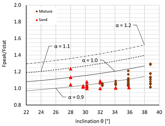 Relation of Fpeak/Fstat as a function of the dynamic pressure coefficient and the inclination of the flume base (θ). For a constant factor α, a higher inclination angle (θ) results in a higher ratio of Fpeak/Fstat.