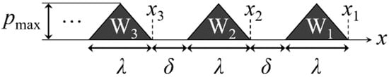In order to investigate the fundamental effects of atmospheric pressure waves on the generation and amplification processes of tsunamis, we introduced a model of atmospheric pressure waves, as in the numerical calculations with a linear shallow-water model [15], because the actual atmospheric pressure waves show complicated wave profiles. That is, it was assumed that the steady atmospheric pressure waves as depicted in Figure 1 traveled in the positive direction of the x-axis at the same constant traveling velocity vp. The profile of the atmospheric pressure waves was an undeformed isosceles triangle with positive pressure. The interval between the atmospheric pressure waves was δ, and the location of the onshore end of the nth atmospheric pressure wave Wn was xn at the initial time, i.e., t = 0 s.