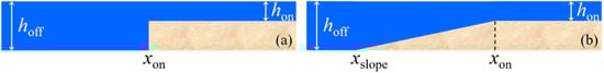 Figure 2 depicts two types of seabed topography in the numerical experiments. The still-water depth in the deepest offshore area is denoted by hoff, which was 5000 m in every calculation, whereas that in the shallowest onshore area is hon. Figure 2a presents a stepped seabed, in which the water depth is discontinuous at x = xon. Conversely, Figure 2b illustrates a seabed including a slope with a constant gradient β at xslope ≤ x ≤ xon.